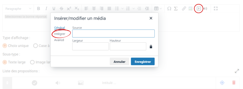 Cliquez sur insert/edit média dans la consigne de l’élément. Copier au minimum le code suivant dans le champ texte qui s’affiche: